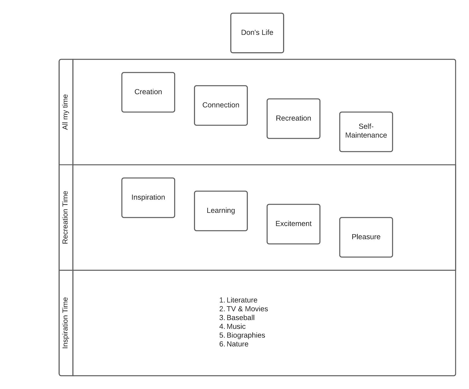To form a time hierarchy, you can’t simply make a list of all the things you value and try to rank them from 1 to 10,000. How would you compare going to the gym to listening to Bach to a new pair of shoes? At that level of analysis, your values are incommensurable. Instead, you need to start by identifying broad categories of values that capture all the things you have to achieve to live a secure, fulfilling life. For example, your list might consist of: